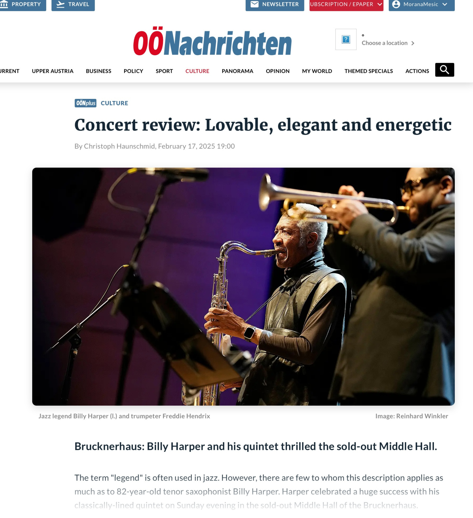 The term legend is often used in jazz. However, few truly deserve this title as much as 82-year-old tenor saxophonist Billy Harper. With his classically arranged quintet, Harper celebrated a tremendous success on Sunday evening in the packed Middle Hall of the Brucknerhaus.